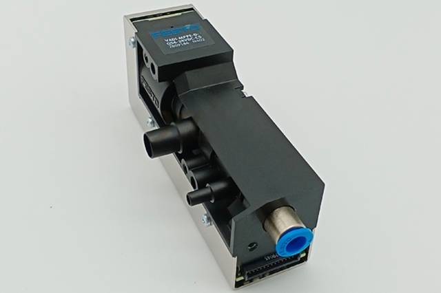電磁閥開啟真空通道,噴嘴生成真空吸附元件。